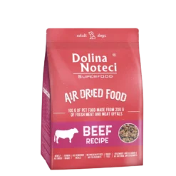 Le plat de bœuf Dolina Noteci SUPERFOOD est un aliment sec complet qui répond entièrement aux besoins nutritionnels des chiens adultes de toutes races. La composition de ses matières premières comprend des nutriments et des composés biologiquement actifs. 100 g de produit fini sont fabriqués à partir de 200 g maximum de viande fraîche et de produits animaux provenant de bœuf, de poulet et de porc. Le processus de séchage doux préserve autant que possible les nutriments des matières premières utilisées pour fabriquer l’aliment. La viande et les produits d’origine animale de bœuf fournissent de précieuses protéines riches en acides aminés et sont une source d’éléments nécessaires à une bonne santé – sélénium, fer et cuivre. La viande de bœuf est également une source de l’importante vitamine B12 et de vitamines liposolubles. L’ajout d’œufs et de graisse de poulet enrichit les aliments secs Dolina Noteci SUPERFOOD en acides gras insaturés essentiels n-6. Les composés biologiquement actifs contenus dans les carottes, les épinards, les myrtilles, les framboises, les oranges et les pois ont des propriétés antioxydantes et anti-inflammatoires. Ils ont un effet significatif sur l’inhibition des changements associés au vieillissement, le développement de l’athérosclérose et les dommages au foie. Les fonctions gastro-intestinales, tant digestives que sécrétoires, sont soutenues par une supplémentation en graines de chia, graines de lin, yucca Mojave et algues. L’ajout de levure de bière et d’inuline de chicorée améliore l’état du pelage et maintient une flore intestinale saine. Les aliments secs Dolina Noteci SUPERFOOD contiennent des ingrédients issus de la moule de Nouvelle-Zélande, qui contribuent à maintenir le cartilage articulaire en bon état et ont un effet anti-inflammatoire sur le tissu osseux. Le respect de la quantité recommandée d’aliments n’entraîne pas de surpoids ni d’obésité. Boire de l’eau fraîche est un bon complément à un régime d’aliments secs pour animaux de compagnie, car cela aide naturellement le chien à absorber les ingrédients qu’il contient.
