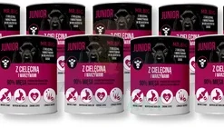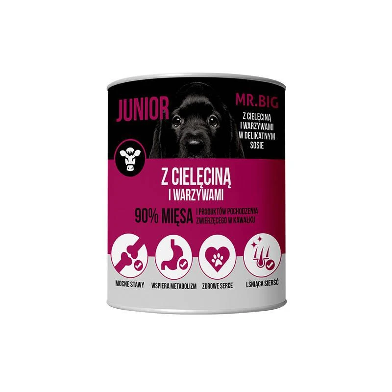 ALIMENT COMPLET JUNIOR À BASE DE VEAU ET DE LÉGUMES, EN MORCEAUX DANS UNE SAUCE LÉGÈRE POUR LES JEUNES CHIENS (4 À 12 MOIS) DE TOUTES RACES.