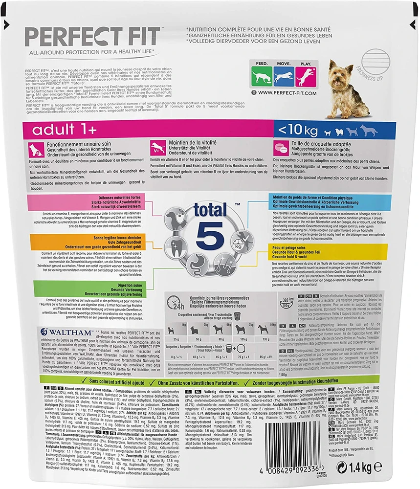 Perfect Fit Adult 1+ Rich with Chicken, qui est un aliment complet, équilibré et savoureux pour un chien de plus d’un an, de petite race (jusqu’à 10 kg) se distingue par sa recette, spécialement adaptée aux besoins d’un petit animal. Des vétérinaires et des nutritionnistes ont participé à son élaboration. Les scientifiques du WALTHAM Institute of Animal Science se sont penchés sur les problèmes de santé les plus courants chez les chiens et, à partir de là, ils ont créé un aliment avec la formule Total 5. Cette recette prend en charge les 5 domaines les plus importants pour la santé de votre animal : assurer un système immunitaire fort, prendre soin de la bouche, une digestion saine, la peau et le pelage, et aider à maintenir une condition et un poids corporel optimaux.