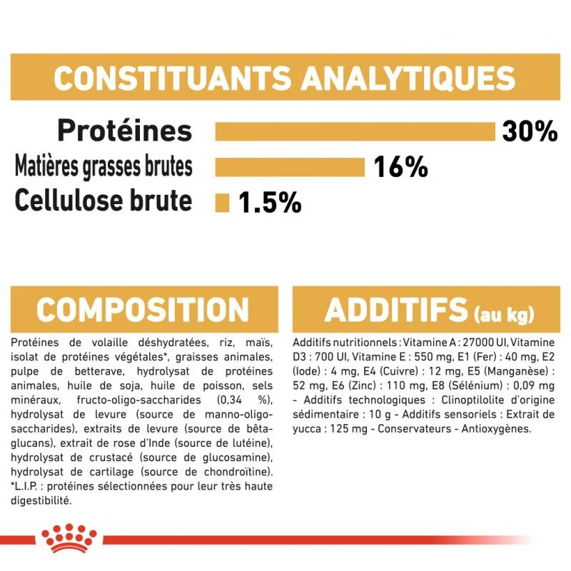 L’association de protéines de haute qualité (L.I.P.*) et de prébiotiques (FOS) favorise la santé du tractus gastro-intestinal et l’équilibre de la flore bactérienne intestinale pour assurer une bonne qualité fécale.