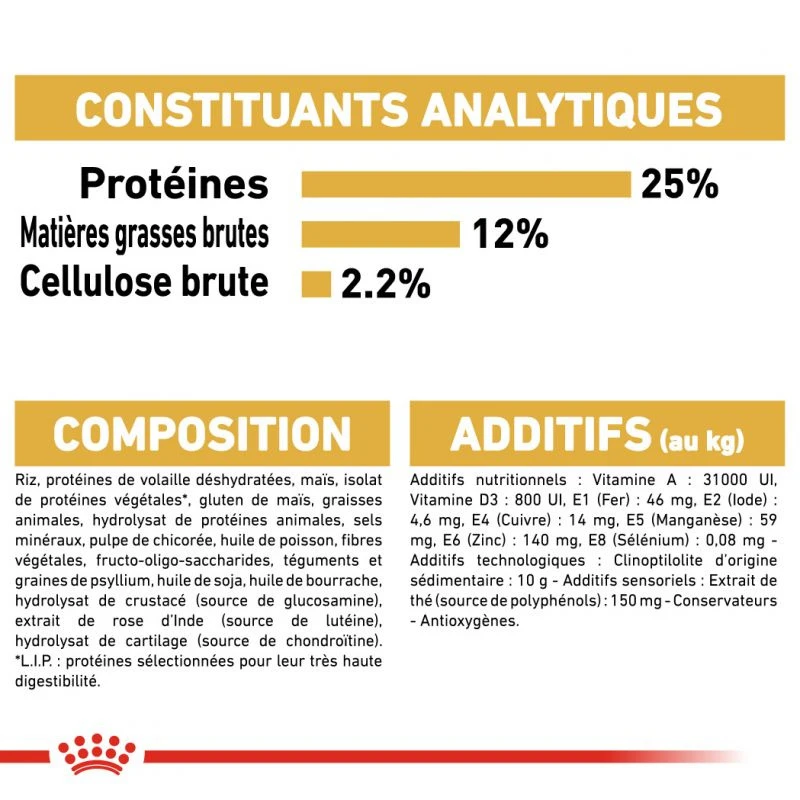 Dans l’aliment ROYAL CANIN Miniature Schnauzer Adult, la teneur en matières grasses est modérée, ce qui, associé à une dose quotidienne d’exercice, favorise le maintien d’un poids corporel sain. Les croquettes ROYAL CANIN Miniature Schnauzer Adult ont été spécialement développées pour les chiens Schnauzer nains. Grâce à l’utilisation de composés liant le calcium (chélateurs), la formule alimentaire favorise l’hygiène bucco-dentaire en inhibant la formation de tartre.