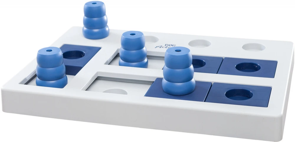 Le jeu d’échecs consiste en un « plateau » avec de petites cavités et des pions en plastique. Vous y cachez de petites friandises que votre chien essaie de sentir. Après quelques essais, votre animal apprendra à ramasser les pions et à ouvrir les tiroirs avec son museau ou sa patte pour obtenir son prix. Les échecs sont un jeu stimulant pour les chiens de tous âges. Il s’agit de l’étape suivante d’un jeu de stratégie et devrait être utilisé après l’entraînement avec le jeu « Solitaire ». Il est protégé contre le glissement par des pieds en caoutchouc.