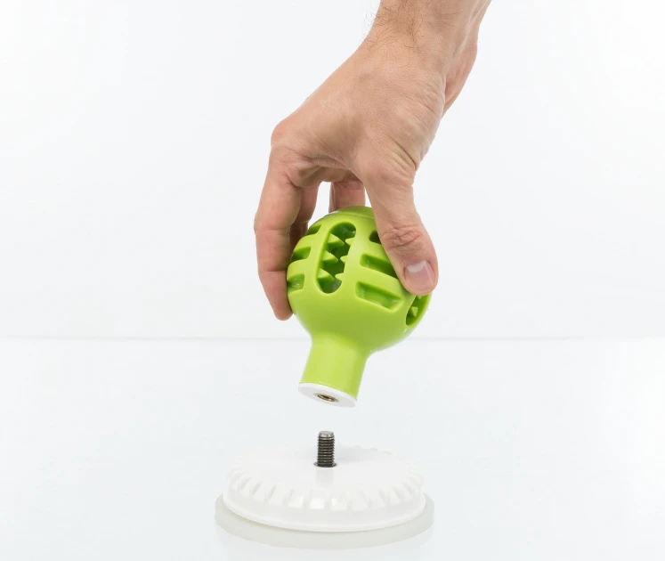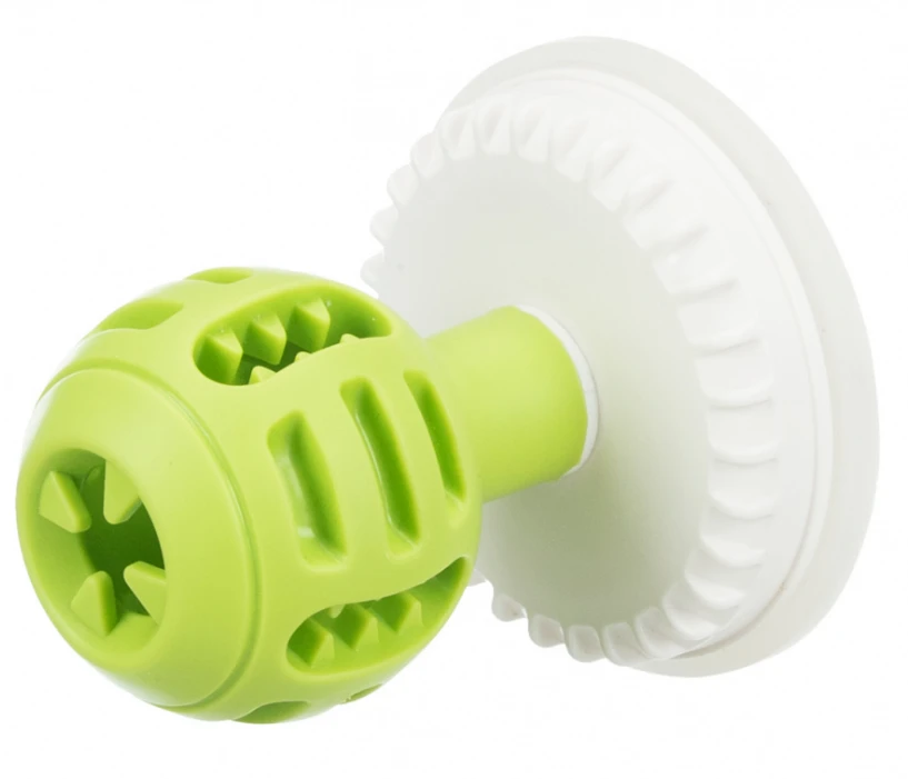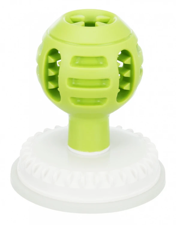 Un jouet à friandise en forme de boule sur une ventouse en caoutchouc thermoplastique. En plus des trous plus larges pour les biscuits et les grosses friandises, le jouet possède également des cavités plus petites dans lesquelles on peut presser du pâté ou de la pâte. Le jouet est doté d’une ventouse, ce qui permet de le fixer sur n’importe quelle surface lisse – par exemple, carrelage, miroir, baignoire. La balle est idéale pour les situations stressantes pour votre chien et le distraira. La balle est une solution idéale pour les chiens qui n’aiment pas les bains et ont peur de l’eau – le léchage calme le chien.